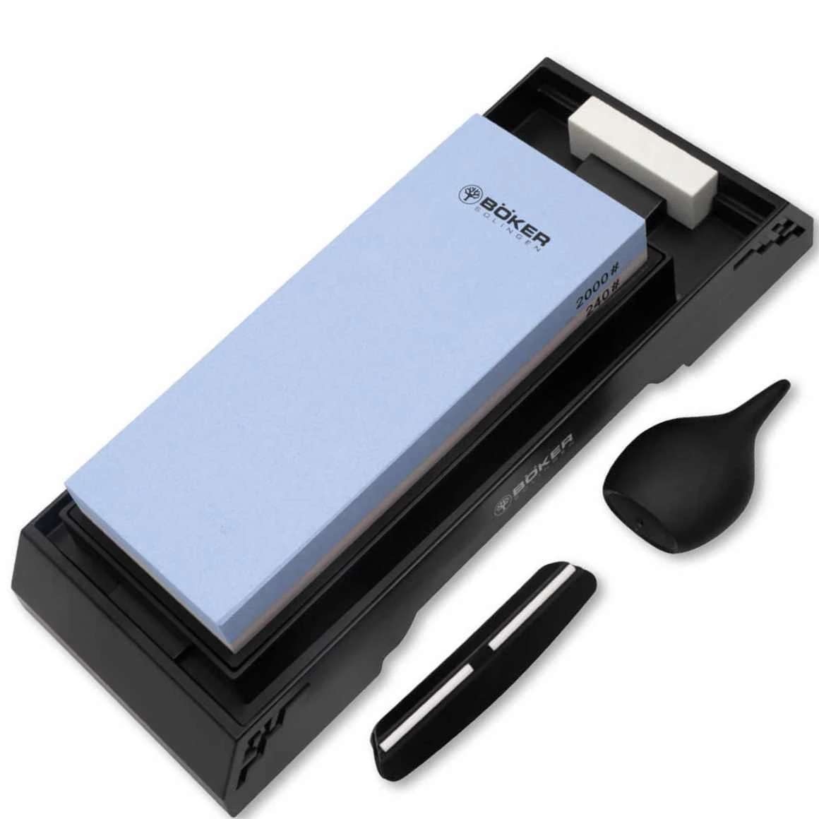 Das Böker Messerschärf-Set enthält einen doppelseitigen Keramikstein mit einer Körnung von 240 / 2000, eine Basis, einen Spender, einen Steinreiniger und einen Klingenhalter. Das gesamte Zubehör kann in den an der Unterseite des Sockels integrierten Klemmen verstaut werden.