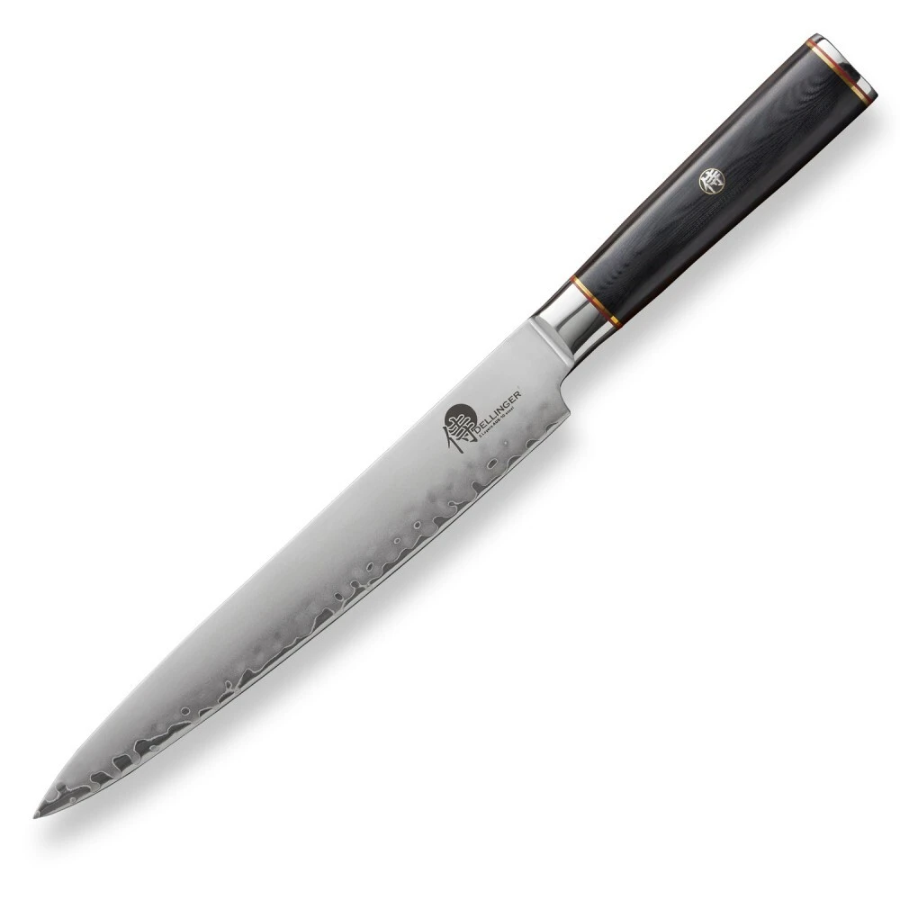 Das Dellinger Okami 3 Lagen Japanisches Aufschnittmesser ist ideal zum Schneiden von Lebensmitteln in dünne Scheiben. Egal, ob Sie rohes oder zubereitetes Fleisch schneiden, mit diesem Messer erhalten Sie präzise geschnittene Stücke. Die Arbeit mit diesem Messer ist schnell, einfach und präzise. Das Fleisch bleibt saftig, es wird perfekt geschnitten. Mit Leichtigkeit und müheloser Bewegung zaubern Sie ein tolles Carpaccio oder hauchdünne Schinkenscheiben.