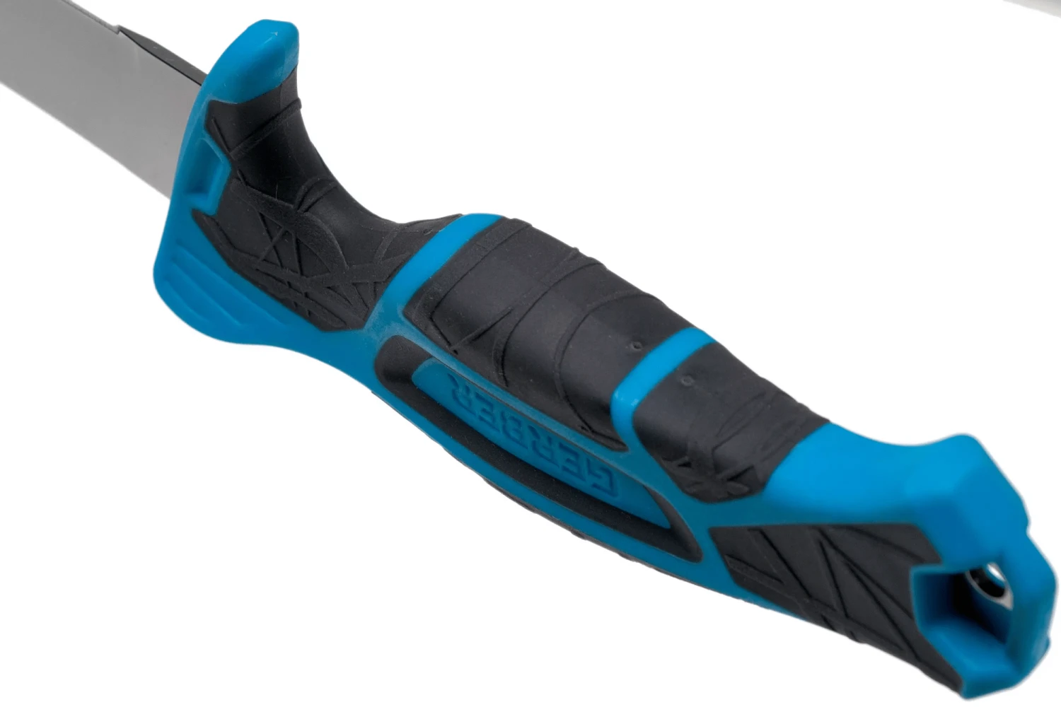 Das Gerber Controller Salt Filetiermesser ist ein solides Werkzeug für Angler zum Filetieren. Gerber arbeitete mit erfahrenen Anglern zusammen, um ein optimiertes Design zu entwickeln. Die lange Klinge aus dünnem 9Cr18MoV-Stahl hat sich hervorragend zum präzisen Filetieren von Fischen bewährt. Diese Klinge ist leicht flexibel, was die Arbeit vereinfacht. Dank der Wahl des rostfreien 9Cr18MoV-Stahls ist die Klinge langlebig und scharf. Seine Oberfläche ist fein poliert, was die Reinigung erleichtert. Diese Version des Controllers gehört zur Salt-Serie, was Sie am blauen Griff erkennen können. Salzmesser eignen sich besonders gut zum Meeresangeln. Der Gerber Controller liegt dank eines durchdachten Griffs aus mehreren Materialien perfekt in der Hand: thermoplastisches Elastomer (TPE) und Glasfaser-Nylon (FRN). Beide Materialien sorgen auch bei Nässe für zuverlässigen Halt. Die Textur und die Rillen an den Fingern am Griff verstärken den Halt und verhindern, dass sich das Messer beim Filetieren verschiebt. Der Daumen findet in einer Nut am Griff seinen Platz und sorgt so für zusätzliche Kontrolle über das Werkzeug während der Arbeit. Das Gehäuse bietet eine hervorragende Funktionalität. Die Belüftungslöcher sorgen dafür, dass das Gehäuse nach Gebrauch gründlich gereinigt werden kann. Die Scheide sichert das Messer zuverlässig und hält es mit einer Schnalle an Ort und Stelle. Die Tasche verfügt über eine Gürtelschlaufe und einen robusten Clip, der ein bequemes Tragen am Rucksack, Gürtel oder in der Tasche ermöglicht. Der innere Teil des Gehäuses ist mit Stahl ausgestattet, was ein einfaches Schärfen des Messers ermöglicht, egal wo Sie sich befinden.
