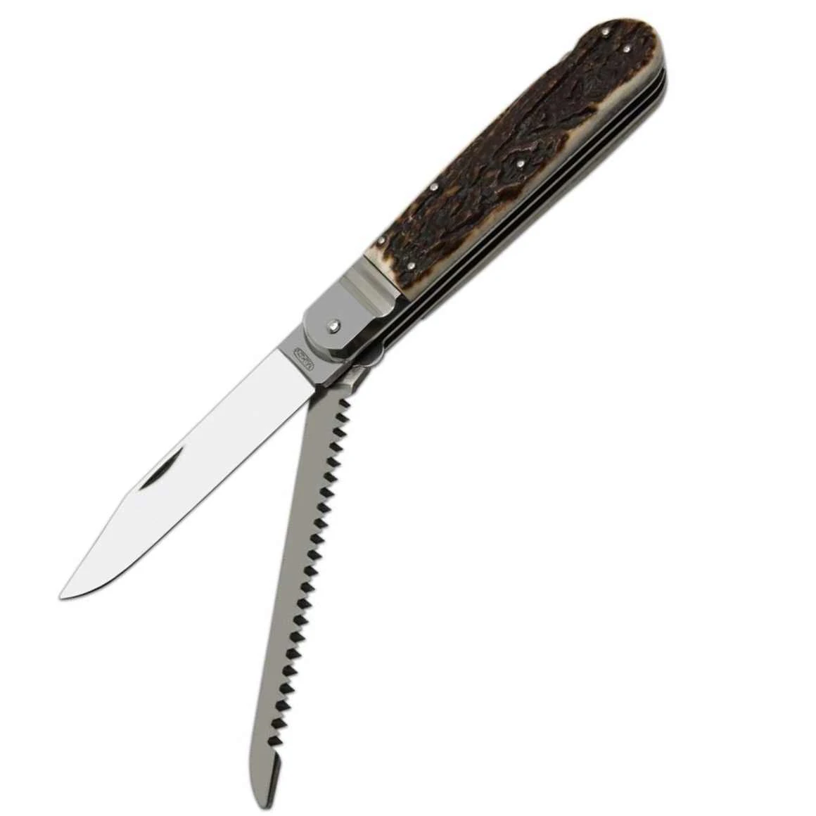 Das Jagdklappmesser Mikov Hunter 230-XP-2 KP wurde nach Kundenwunsch entwickelt und basiert auf dem Messer FIXIR – Hunter ist 1/3 größer. Die Klinge besteht aus hochwertigem 440 A Stahl mit einer Backlock-Sicherung. Der Griff besteht aus echtem Hirschgeweih. Es enthält auch eine Säge mit einer Linerlock-Sicherheit. Kommt in einer Ledertasche.