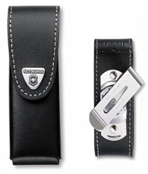 Das schwaze Leder Victorinox Etui geeignet für Messer mit einer Größe von 11,1 cm bis zu 4 Schichten. Es schließt mit Klettverschluss und kann an einem Gürtel befestigt werden. Es hat auch einen rotierenden Clip.