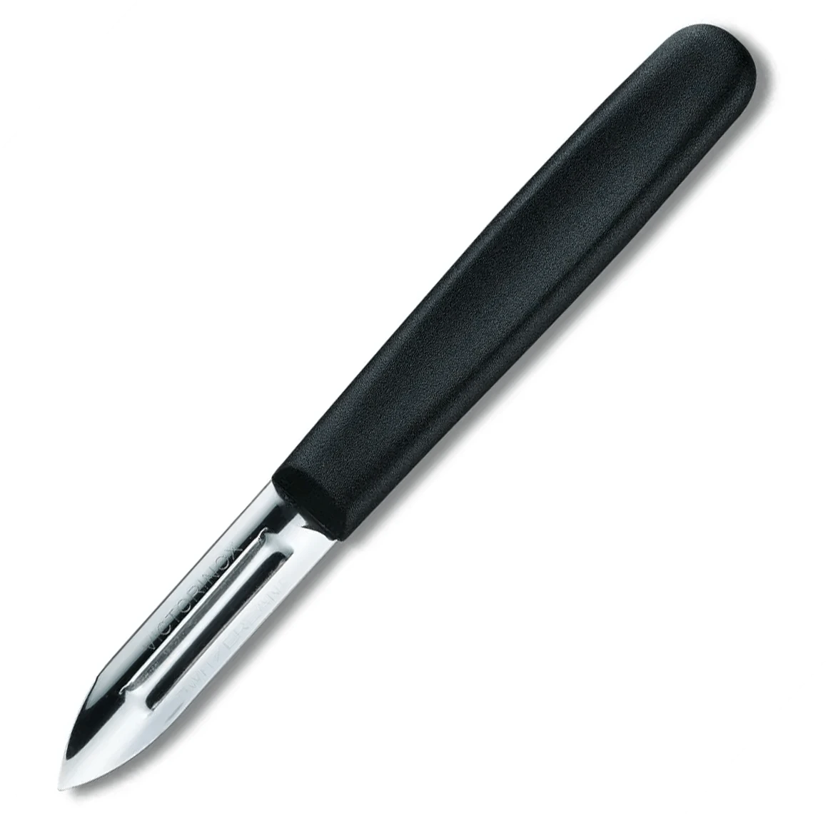 Victorinox doppelseitiger Küchenschäler für Kartoffeln, Gemüse und Obst mit Edelstahlklinge und schwarzem Polypropylengriff.