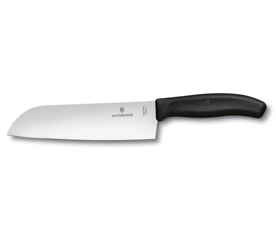 Das japanische Allzweck-Küchenmesser Victorinox Santoku, ideal zum Würfeln mit einer feststehenden breiten Klinge mit einer glatten Kante aus Edelstahl und einem Griff aus schwarzem TPE (thermoplastisches Elastomer).