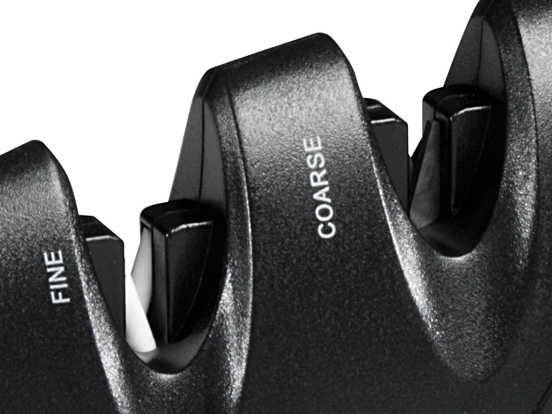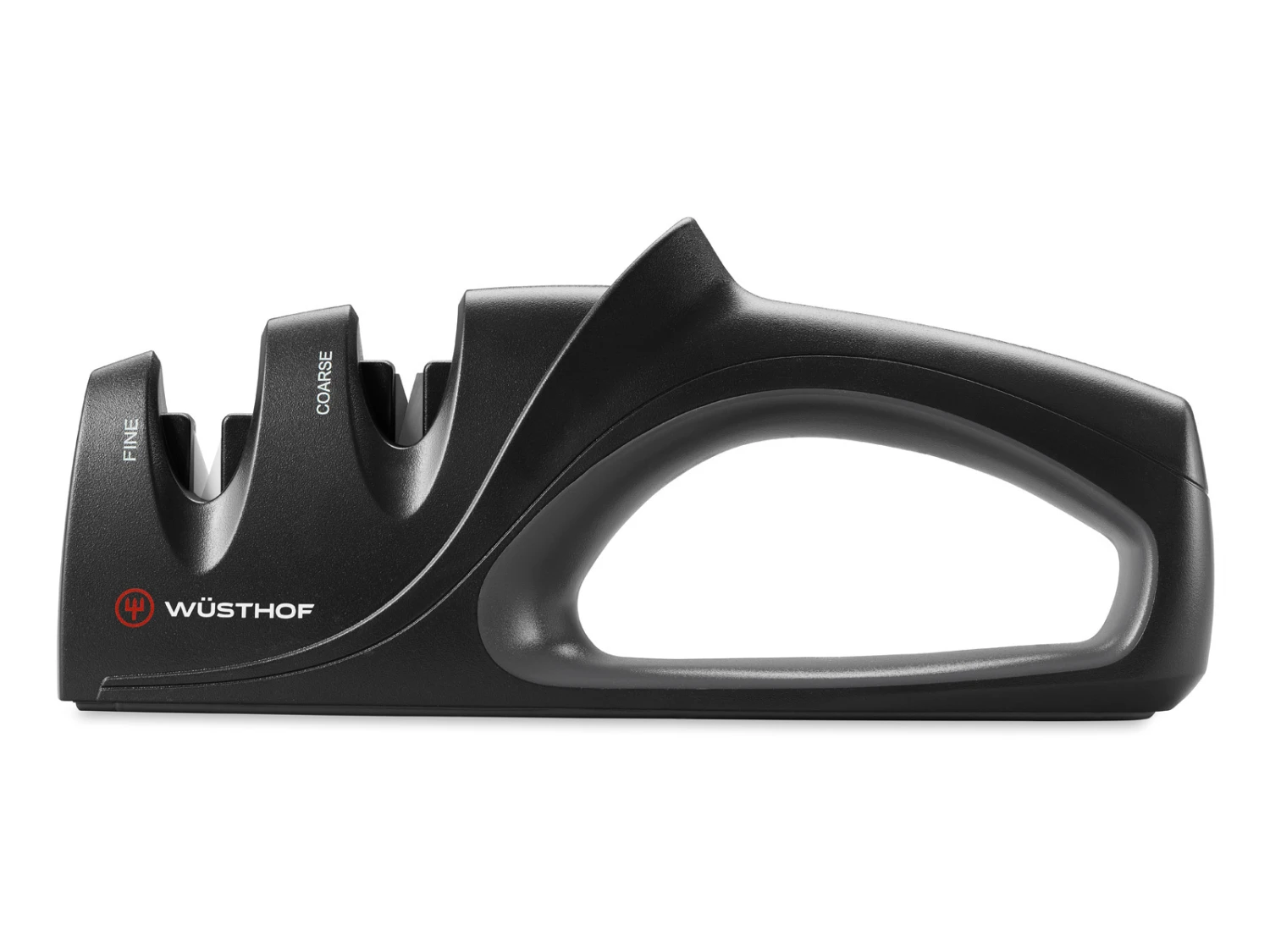 WUSTHOF-Zweistufen-Messerschärfer zum Schärfen von Messern mit glatten, gezackten und gewellten Klingen (gezackte und gewellte Klingen nur auf der Feinkeramikstufe). Mit nur wenigen Handgriffen bleiben Ihre Messer scharf. Die erste Sorte (Karbid) ist für die Wiederherstellung einer stumpfen Schneide, die zweite Sorte (Keramik) ist sowohl für das Feinschärfen nach der ersten Sorte als auch für die regelmäßige Wartung der Klinge geeignet. Die robuste Kunststoffkonstruktion bietet eine sichere Plattform für die Arbeit mit Messern. Der Griff ist gummiert und bietet auch bei Nässe einen sicheren Halt.