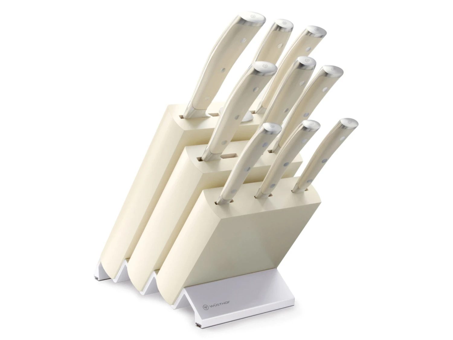 Klassisches Ikon 9-teiliges Messerset mit Messerablage. Vollständig geschmiedete Messer mit ergonomischen Griffen. Neu mit einem Brotmesser mit doppeltem Wellenschliff, das länger scharf bleibt, weniger Druck erfordert und für sehr präzise, glatte Schnitte geeignet ist. Hartes Brot wird beim Schneiden mit dieser zweischneidigen Klinge nicht eingeklemmt, und weiches Brot wird geschnitten, ohne die empfindliche Oberfläche zu zerreißen.