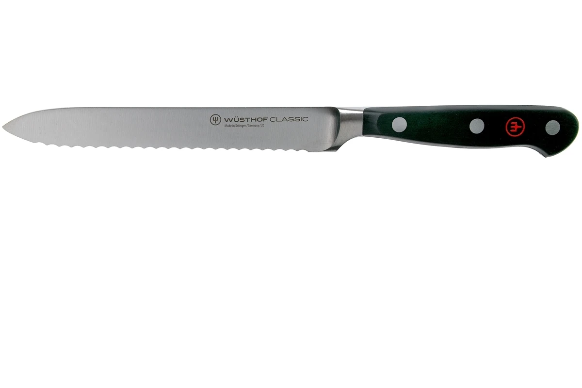 Wüsthof Klassisches Messer zum Schneiden von Wurst oder einem Käseblock, es kann sogar Brot schneiden. Dank der 14 cm langen Wellenschliffklinge beißt sich das Messer problemlos hinein. Die Klinge besteht aus dem Standard-Edelstahl X50CrMoV15, der leicht zu pflegen ist und das Messer immer einsatzbereit macht.